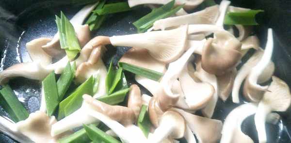 小贴士:平菇是最敏感的蘑菇之一。平菇的根部很脏,需要清洗干净。平菇一定要泡在盐水里,然后撕成小块。不要忘记将平菇晾干以备后用。绿色大蒜应去除枯叶。炒牛肝菌的时候要多加点油和蒜,下入切好的牛肝菌翻炒,炒去水分,加入青蒜炒熟,最后撒上盐和生抽。和蚝油翻炒均匀,收汁起锅。