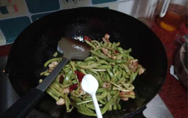 6:最后加入酱油拌匀。也可以加入几滴香油,搅拌均匀,然后起锅。香脆可口、营养美味的贡菜炒肉就做好了。