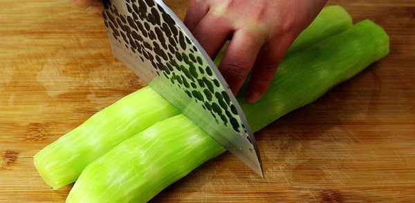 第三步烹调:将生菜切成片或片,锅中加水烧开,撒些盐,将生菜片焯水捞出,这样生菜很干。