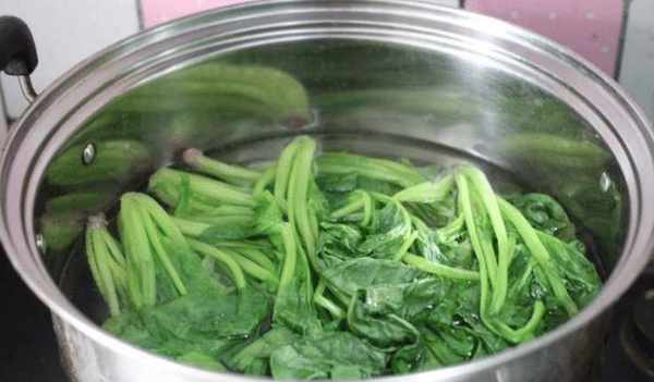 烹饪步骤3:菠菜叶中含有大量的叶酸和钙,但这两者容易发生反应。你需要烧一壶干净的水。将菠菜焯水10秒,迅速取出切块待用。