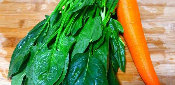 选料:买一串菠菜(350克左右,菠菜的品种很多,一定要选阔叶的菠菜。菠菜一定要选叶子很绿的。发黄的菠菜一般是失水的菠菜。菠菜的根一定要发育好的,建议选择红根的菠菜,菠菜一定要尽快吃完,不然可以冷藏),准备胡萝卜一个半(胡萝卜的表皮一定要光滑,不能下垂。)胡萝卜越粗越好。建议选择中等大小的胡萝卜,太粗的不要买变形的),准备蒜头,适量盐,鸡精一小勺,蚝油一小勺,一点水和其他。