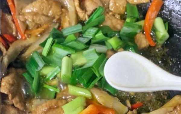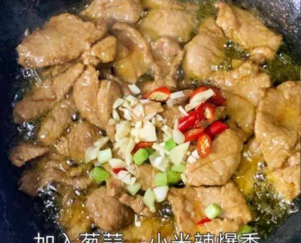 第五步:锅底调入适量食用油,倒入一些猪肉片,等待肉片炒至变色,加上一些葱花,姜蒜和小米辣,迅速翻炒一会儿。