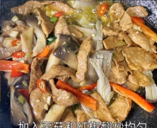 用辣椒和平菇烹制的瘦猪肉是一道开胃菜。这里有肉有菜,肉很软。骨蘑菇非常柔软可口。