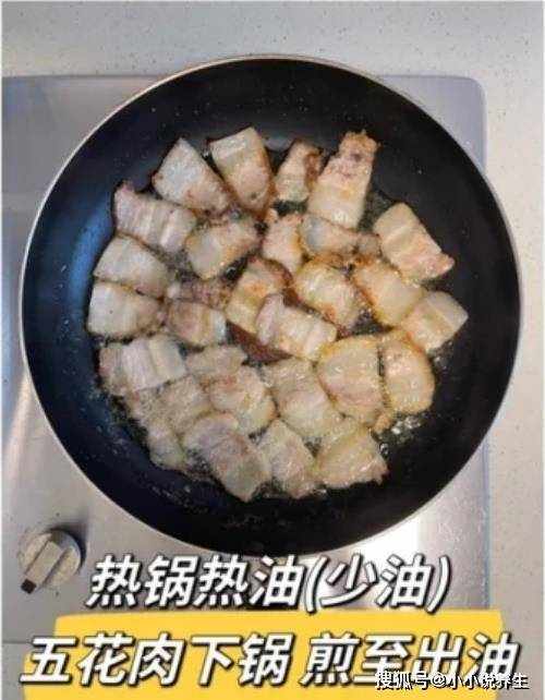 第四:锅底放少许植物油,将五花肉倒入锅中用小火慢煎至油炸透。