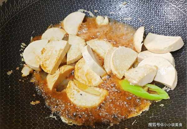第七步:加入少许鸡精和味精,快炒30秒左右,将素鸡炒至入味,加少许酱油快炒片刻。