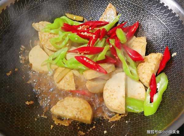 第六步:加入一勺生抽和蚝油,盖上锅盖稍煮,让素鸡入味,加入青红椒粒调色。