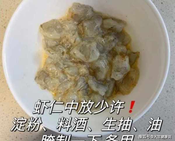 第四步:事先用料酒把虾去腥,加一滴生粉,加半勺生抽,加少许橄榄油,用手反复揉搓均匀,腌制至少10分钟。