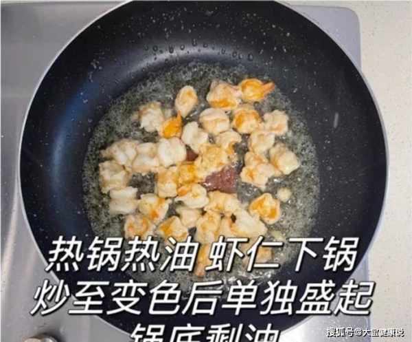 第五步:锅中加入少许橄榄油,倒入腌好的虾仁,将虾仁煎至变色,快速翻炒均匀备用。