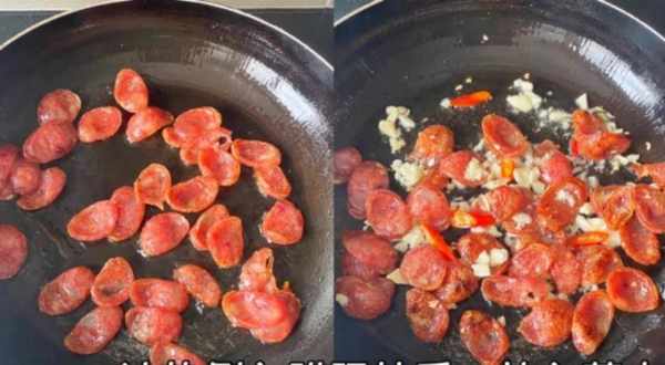 第三步:锅底慢慢烧热,加入少许橄榄油,倒入一些香肠翻炒,炒出香肠的香味。