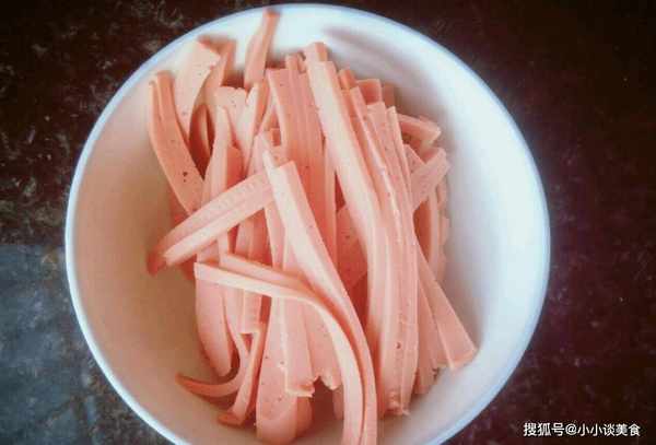 第三步:一根火腿肠切成几根细丝,白玉菇去根,香菇去蒂。将它们都用盐水浸泡,洗净,将香菇切成几块。白玉菇用水焯一分钟,检查干菇的水分。