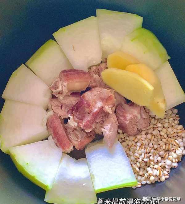 准备食材:选择300克左右的脊骨(脊骨的骨头比较多,肉会比较小。脊骨汤的营养在骨髓里,可以补钙或者补脑。夏天记得多炖脊骨给家人煲汤煲汤。果汁也很好吃),一小碗优质薏米(约50克,薏米是夏季去湿气的食材之一,可以去湿排毒,补水到清热解暑,非常适合煲汤),生姜15克,老冬瓜280克,陈皮两片,料酒少许,盐少许,白胡椒半勺,半勺一勺极鲜味,两滴香油,几根葱等。