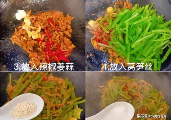 6:加入姜末、蒜末和辣椒片,快速翻炒片刻,倒入焯过水的生菜丝,将辣椒片和蔬菜炒匀。7:加少许水淀粉勾芡,加盐一汤匙半,鸡精一汤匙,胡椒粉少许,快速拌匀,收汁捞出碗中。已经完成了。