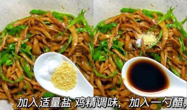 第五步:加入磨碎的青椒或小米椒,加半勺鸡精和盐,选一勺香醋翻炒片刻。