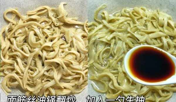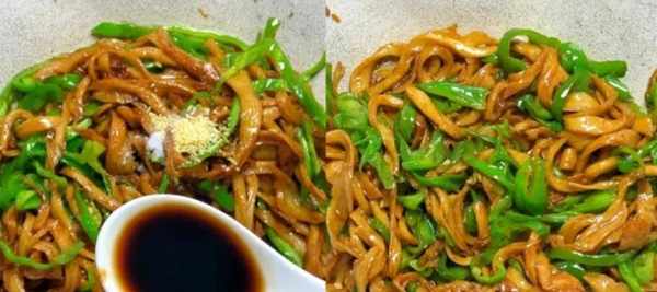 第四步:倒入面筋条,大火快速煎几分钟,面筋炒软,加一勺生抽,加半勺老抽,加半勺白糖和快速翻炒片刻。