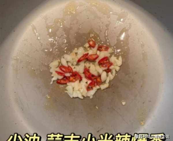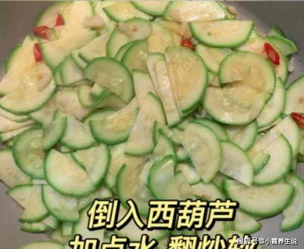 6:锅底继续加油,加入蒜末和小米椒爆香,倒入一些西葫芦片,快炒至生,也可以倒入少许水快速翻炒均匀.