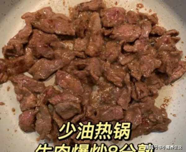 5:提前将锅底慢慢预热,加入冷油烧热,滑入一些牛肉片,快速翻炒片刻,翻炒至8熟备用。