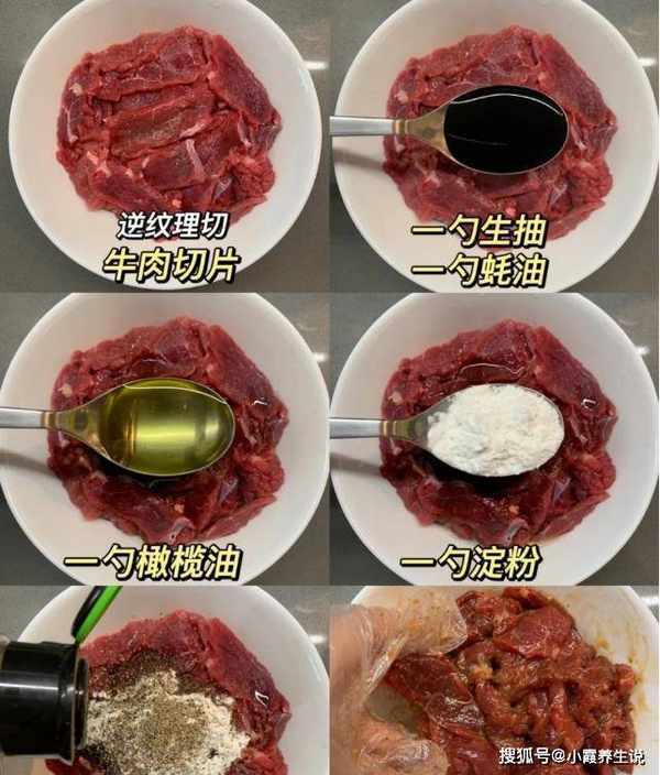 2:将牛肉片放入容器中,加入一勺生抽,一勺蚝油,撒上盐和胡椒粉调味,加入一勺红薯淀粉(视牛肉的多少而定),滴一些橄榄油、牛肉片快速均匀地抓取,静置20分钟左右。