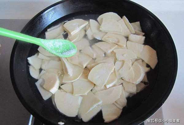 烹饪步骤4:烧开一锅清水,将冬笋放入冷水中,撒上2汤匙盐,少许食用油,将冬笋用热水煮几分钟捞出。冬笋的涩味,沥干水分备用。