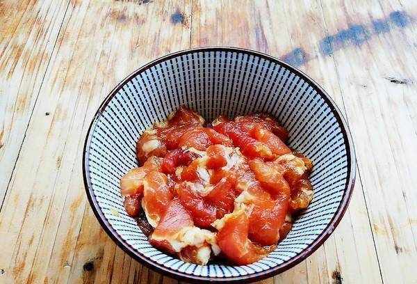 第三步:瘦肉洗净切成薄片,将瘦肉全部放入碗中,加入料酒去腥,取少量生抽,加盐腌制,撒生粉或取好淀粉加入色拉油,使肉片完全熟透,这样炸出来的肉松软香香,没有鱼腥味。