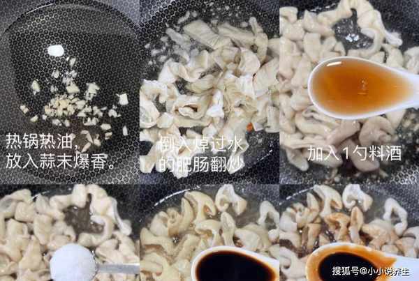 第五:锅底加入适量色拉油,油微热,加入蒜末和姜末,快速翻炒片刻,倒入焯好的猪大肠,转大火翻炒-快炒一会儿。