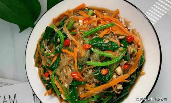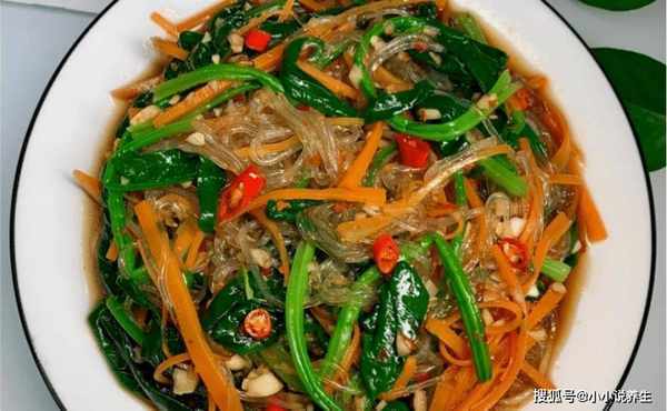 菠菜胡萝卜拌粉丝是菠菜的最佳吃法。菠菜青嫩,富含铁和钙。胡萝卜中的胡萝卜素尤其丰富。将其与粉丝混合。粉丝非常灵活。菠菜鲜绿,拌上酱汁味道鲜美,爽口可口,开胃。