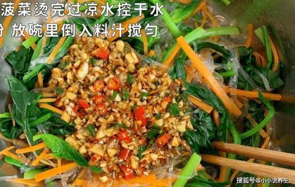 5:锅底油烧热,淋上酱汁,再淋上热油,用筷子搅拌均匀即可食用。这道菠菜胡萝卜拌粉丝就做好了。