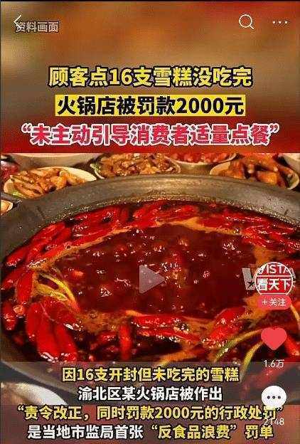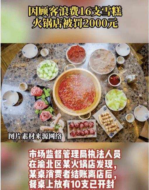 重庆渝北,一行人去火锅店就餐时,因为感觉到热,便点了16根雪糕,不料没有吃完,市监局见状,认为火锅店未主动引导消费者适量点餐,存在浪费食物的情况,遂对火锅店作出罚款2000元,责令立即改正的行政处罚。事发当天,市监局工作人员正在例行检查时发现,某个刚刚散场的桌子上,零零散散的放置了16根雪糕,工作人员仔细数了数,发现16根雪糕全部开封,但其中10根开封了没有食用,6根只食用了一半。