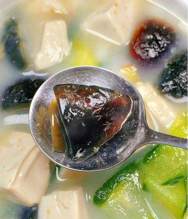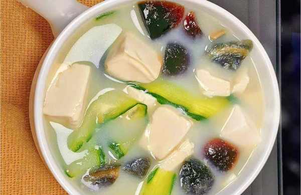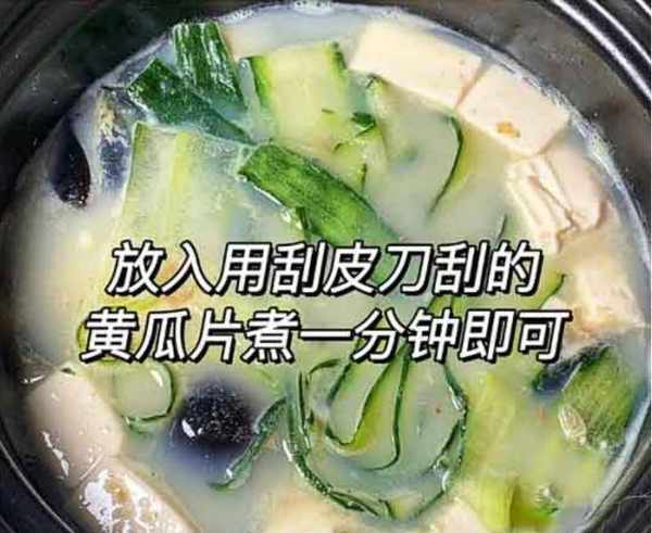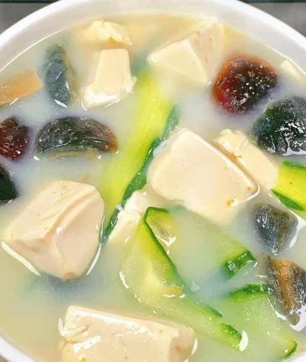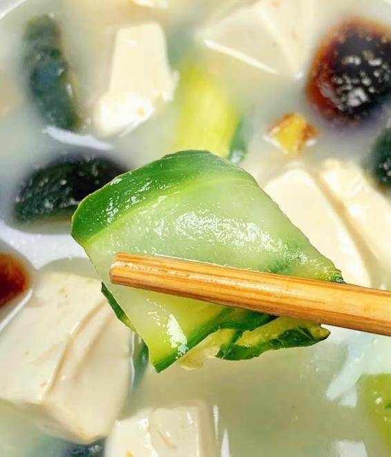 黄瓜豆腐皮蛋是一道适合夏季食用的素汤。它比鸡汤和鸭汤便宜。汤非常鲜美可口。补充钙质和优质蛋白质,补充大量水分,消脂改善肠淤血。他一到桌子就自己吃了。