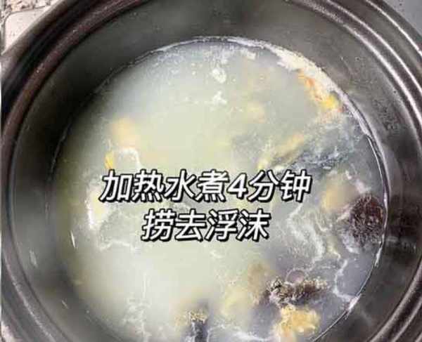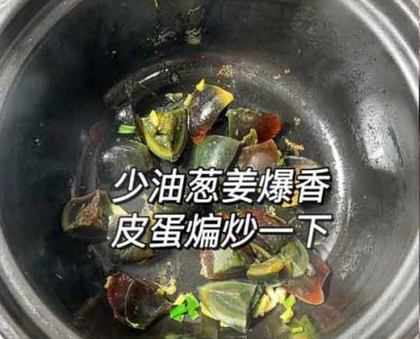 第五步:倒入一些皮蛋块,快速煎至微黄,加入两大碗热水烧开,煮约4分钟,用勺子撇去浮沫。