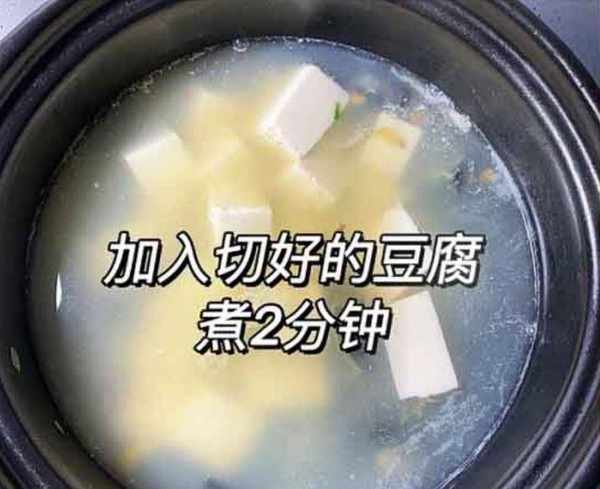 第六步:放入一些豆腐块,盖上锅盖煮2分钟,汤变成乳白色,加入一滴盐,半勺白胡椒粉,一茶匙鸡汤,半勺鲜汤,搅拌。