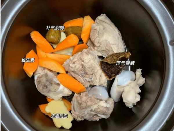第五步:将猪骨、胡萝卜、陈皮放入炖锅中,加入适量姜片,放入适量蜜枣,加适量清水,盖上锅盖,大火煮熟。