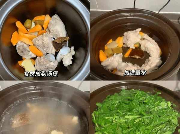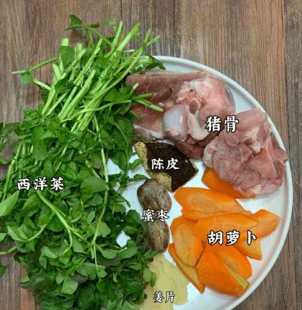 选料:多选新鲜的西洋菜(西洋菜是广东地区常见的蔬菜,叶子应该很鲜嫩,可以用来炖汤。很多地方都叫西洋菜,非常适合干燥的气候。润肺清喉)准备胡萝卜一根,陈皮一片,蜜枣若干,买块茎骨500克,准备生姜一片,料酒少许,黄酒少许,清一些水和热水,少许盐和胡椒粉,少许鸡精,其他调料。