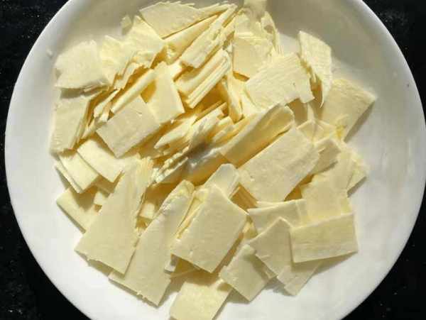第二步:将冬笋去皮部分,留下嫩冬笋,剪掉末端的老茎,将冬笋切成几片薄片。