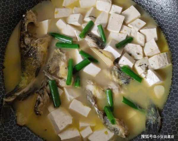 4:加入适量姜丝,倒入足量开水,使鱼头浓稠呈乳白色,稍煮鱼汤。5:待鱼汤呈乳白色时,加入豆腐块煮约5分钟。8分钟,撒上一勺盐,半勺胡椒粉,提味,用勺子推,不要搅拌,避开黄骨鱼和豆腐碎。