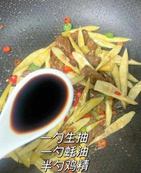 第七步:加少许生抽和蚝油调味,加入半勺鸡精、盐等调料,大火收汁,关火出锅。这道炒牛肉配泡椒和笋。好看又好吃,下饭的好搭档,赶快给家人吃吧。