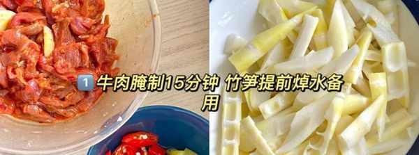 第五步:锅中烧两碗水,烧开后倒入笋片,焯水后捞出,预热锅底,加入少许食用油,放入姜末翻炒,倒入牛肉片。和炒,离开。将牛肉片煎至变色,然后放入容器中备用。