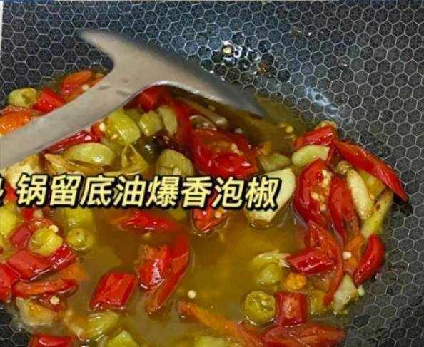 第六步:锅底继续下油,放入泡椒和小米椒,翻炒几下,倒入事先炸好的牛肉片,记得火候要大一些。