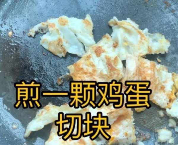 第三步:小葱切薄片,锅底倒少许油,锅内打入鸡蛋,中小火煎片刻,两面煎至变硬,分成小份.块放在一边。