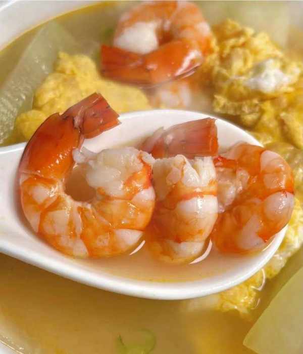 材料:买280克老蜡瓜(老冬瓜是盛产季节的冬瓜。这样的话,瓜肉很厚实,味道很甜,特别适合蒸和蒸汤)和虾120克(虾的大小虾尾很大,肉很厚,适合做虾,炸虾也好,水煮也好,都很好),鸡蛋几个,姜几片,大蒜几个头,植物油少许,水足,味道很鲜,盐和鸡精少许,小葱2个,白醋一滴,淀粉少许,香油两滴,一勺玉米淀粉,半勺黑胡椒和其他香料。