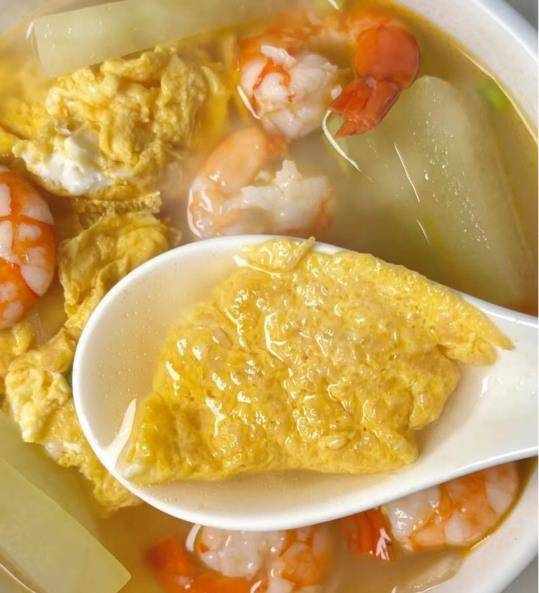 冬瓜虾仁鸡蛋汤是一道非常美味的鲜汤。它很有营养。汤的脂肪含量很低,很健康,卡路里也很低。如果我每天都喝它,你就不会生气了。它有助于调节身体的卡路里摄入量。小姐姐们记住了,千万不要错过哦。