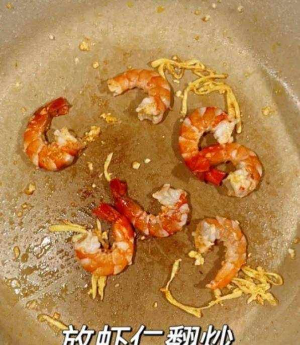 第五步:锅底加少许橄榄油,油烧热,放入小葱、姜末、蒜末,快炒出香味,加入虾仁,炒熟待变色。把虾变成褐色。