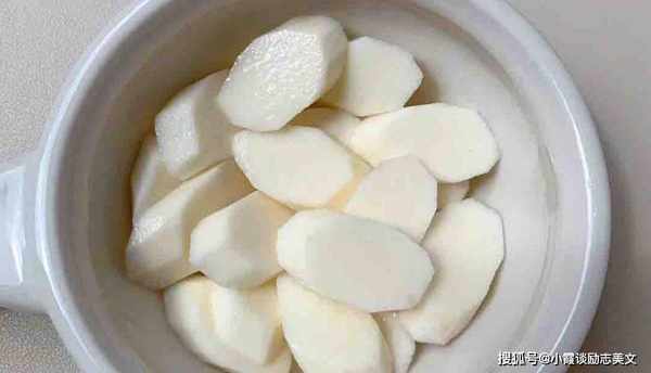 第一步:提前购买优质山药、胡萝卜、排骨,先将山药去皮,切去山药两端,洗净斜切,山药片用冷水浸泡,捞出检查水分.