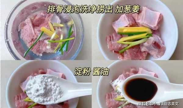 第四步:将排骨放入容器中,加入少许姜丝和葱花,加入一勺淀粉,加入原味酱油和一勺料酒去腥。