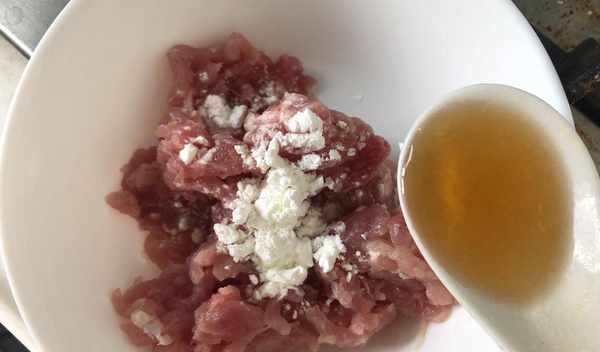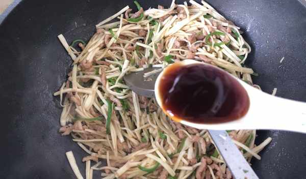 第四步:取出锅,洗净并预热锅底,加入更多的油,将油加热至高温,加入猪肉末炒,用锅铲快速炸,待炒熟。猪肉炸到变色,证明猪肉碎炒好了,最后加入一小勺料酒和生抽,快速翻炒均匀。