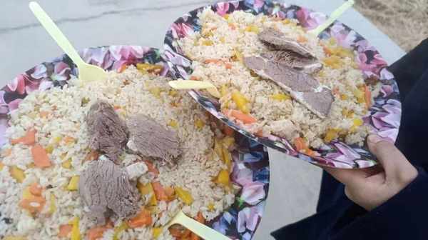 来到新疆,自然也要体验一次手抓饭,更重要的原因当然是想要解答心中的疑惑:“对于手抓饭,大家真的是用手抓着吃吗?”当颗粒金黄饱满的手抓饭被端上来,首先映入眼帘的就是晶莹锃亮的萝卜丁以及均匀铺在盘面上的葡萄干。一旁同事解释下,我才了解到,初始的手抓饭确实是用手抓着吃,但随着时代的进步,目前仅在极为传统的家庭中还用手抓——全家人围坐在地毯上,将抓饭盛在盆中铺平,单手做出数字七的手势,顺着盆沿转半圈,抓一小撮送进嘴里。