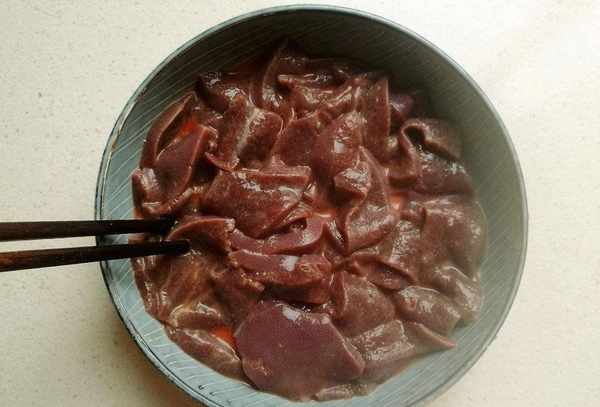 1️⃣:将买回来的猪肝泡水,然后去掉表面的血沫,将猪肝逆纹切开,切开猪肝的毛细血管,一大块猪肝切成薄片,将整个猪肝切开泡软在啤酒方面,啤酒也可以用来去除腥味。