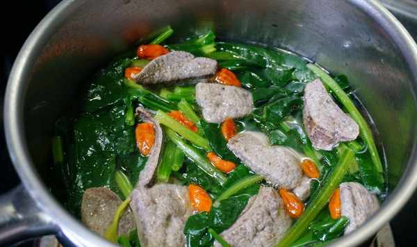 6️⃣:等到猪肝的颜色变白了,加入菠菜稍微煮一会,再加入一些枸杞小火煮一会。