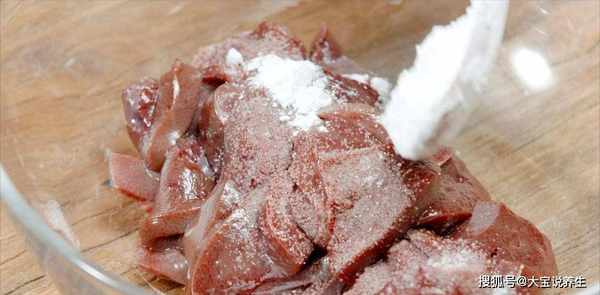 第三步:猪肝沥干水分,不要忘记把表面的粘液洗干净,然后盛入碗中。食用油不要忘记多放(主要是帮助固定营养),加点酱油和少许盐,最后裹上一层淀粉,用手捏住,让猪肝完全盖住。