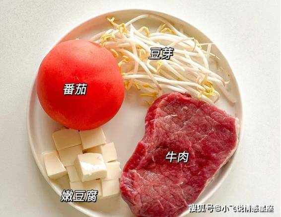 买些食材:买优质豆芽50克左右,选鲜嫩牛肉280克,买大番茄一个,大葱3根,嫩豆腐200克左右,温水少许,水适量,几滴姜片、红薯淀粉一勺、原味酱油少许、料酒少许、色拉油少许、盐少许、白胡椒粉5克、鸡汤半勺、番茄半勺酱汁和其他香料。