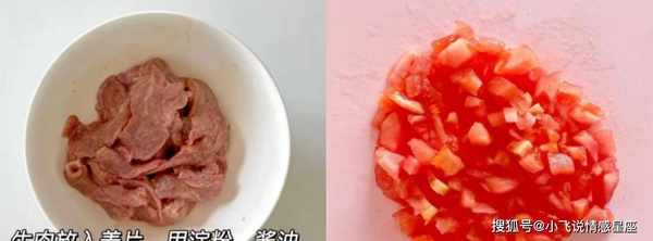 第一步:选择豆芽、豆腐、西红柿和嫩牛肉,先把西红柿用刀切好,用热水烫一下皮,撕掉表层的皮,把西红柿切成小方块,这样比较容易炒番茄汁。